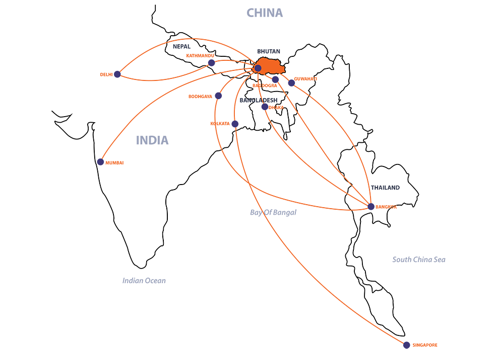 Air Entry: your e-tickets will be emailed to you prior to your departure from your station. We will reconfirm your ticket and let you know of any changes. The Druk Air or Bhutan Airlines carrier operates flights to limited destinations, (i) Bangkok in Thailand; (ii) New Delhi, Mumbai Bagdora, Kolkata and Guwahati in India; (iii) Kathmandu in Nepal.(iv) Singapore.